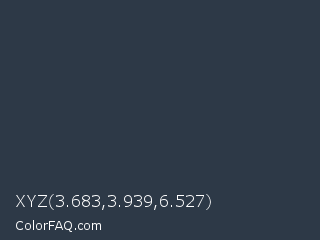 XYZ 3.683,3.939,6.527 Color is a dark blue color and the nearest color is Tuna #353542. Hex code #2d3947 and RGB value is rgb(45,57,71). In RGB color space, this color is composed of 18% red, 22% green, 28% blue, In CMYK color space, this color is composed of 37% cyan, 20% magenta, 0% yellow , 72% black , In HSL color space, this color has a hue angle of 212° , 22% saturation and 23% lightness.
