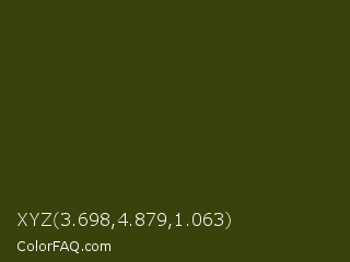 XYZ 3.698,4.879,1.063 Color is a very dark lime color and the nearest color is Waiouru #363c0d. Hex code #38430b and RGB value is rgb(56,67,11). In RGB color space, this color is composed of 22% red, 26% green, 4% blue, In CMYK color space, this color is composed of 16% cyan, 0% magenta, 84% yellow , 74% black , In HSL color space, this color has a hue angle of 72° , 72% saturation and 15% lightness.