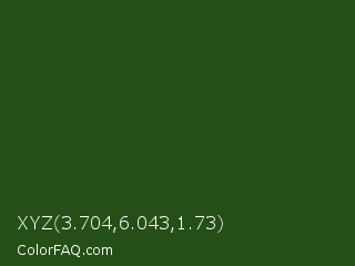 XYZ 3.704,6.043,1.73 Color is a very dark green color and the nearest color is Green House #24500f. Hex code #254f16 and RGB value is rgb(37,79,22). In RGB color space, this color is composed of 15% red, 31% green, 9% blue, In CMYK color space, this color is composed of 53% cyan, 0% magenta, 72% yellow , 69% black , In HSL color space, this color has a hue angle of 104° , 56% saturation and 20% lightness.