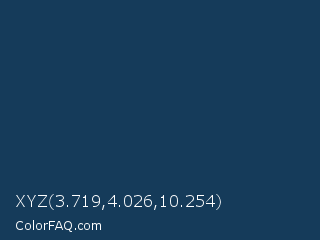 XYZ 3.719,4.026,10.254 Color is a very dark blue color and the nearest color is Cello #1e385b. Hex code #153b5a and RGB value is rgb(21,59,90). In RGB color space, this color is composed of 8% red, 23% green, 35% blue, In CMYK color space, this color is composed of 77% cyan, 34% magenta, 0% yellow , 65% black , In HSL color space, this color has a hue angle of 207° , 62% saturation and 22% lightness.