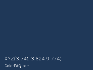 XYZ 3.741,3.824,9.774 Color is a dark blue color and the nearest color is Cello #1e385b. Hex code #1f3858 and RGB value is rgb(31,56,88). In RGB color space, this color is composed of 12% red, 22% green, 35% blue, In CMYK color space, this color is composed of 65% cyan, 36% magenta, 0% yellow , 65% black , In HSL color space, this color has a hue angle of 214° , 48% saturation and 23% lightness.