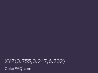 XYZ 3.755,3.247,6.732 Color is a dark indigo color and the nearest color is Martinique #363050. Hex code #372e49 and RGB value is rgb(55,46,73). In RGB color space, this color is composed of 22% red, 18% green, 29% blue, In CMYK color space, this color is composed of 25% cyan, 37% magenta, 0% yellow , 71% black , In HSL color space, this color has a hue angle of 260° , 23% saturation and 23% lightness.