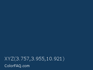 XYZ 3.757,3.955,10.921 Color is a very dark blue color and the nearest color is Cello #1e385b. Hex code #133a5d and RGB value is rgb(19,58,93). In RGB color space, this color is composed of 7% red, 23% green, 36% blue, In CMYK color space, this color is composed of 80% cyan, 38% magenta, 0% yellow , 64% black , In HSL color space, this color has a hue angle of 208° , 66% saturation and 22% lightness.