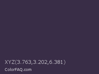 XYZ 3.763,3.202,6.381 Color is a dark violet color and the nearest color is Martinique #363050. Hex code #392d47 and RGB value is rgb(57,45,71). In RGB color space, this color is composed of 22% red, 18% green, 28% blue, In CMYK color space, this color is composed of 20% cyan, 37% magenta, 0% yellow , 72% black , In HSL color space, this color has a hue angle of 268° , 22% saturation and 23% lightness.