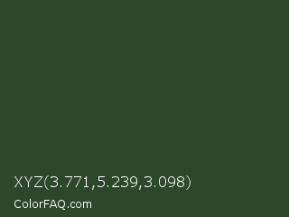 XYZ 3.771,5.239,3.098 Color is a very dark green color and the nearest color is Kombu Green #354230. Hex code #2d472b and RGB value is rgb(45,71,43). In RGB color space, this color is composed of 18% red, 28% green, 17% blue, In CMYK color space, this color is composed of 37% cyan, 0% magenta, 39% yellow , 72% black , In HSL color space, this color has a hue angle of 116° , 25% saturation and 22% lightness.