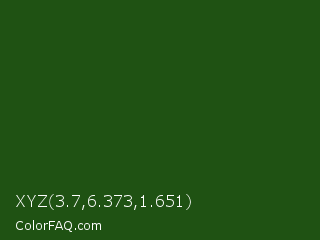 XYZ 3.7,6.373,1.651 Color is a very dark green color and the nearest color is Green House #24500f. Hex code #1f5213 and RGB value is rgb(31,82,19). In RGB color space, this color is composed of 12% red, 32% green, 7% blue, In CMYK color space, this color is composed of 62% cyan, 0% magenta, 77% yellow , 68% black , In HSL color space, this color has a hue angle of 109° , 62% saturation and 20% lightness.