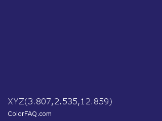 XYZ 3.807,2.535,12.859 Color is a dark indigo color and the nearest color is Lucky Point #1a1a68. Hex code #272266 and RGB value is rgb(39,34,102). In RGB color space, this color is composed of 15% red, 13% green, 40% blue, In CMYK color space, this color is composed of 62% cyan, 67% magenta, 0% yellow , 60% black , In HSL color space, this color has a hue angle of 244° , 50% saturation and 27% lightness.