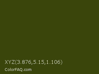 XYZ 3.876,5.15,1.106 Color is a very dark lime color and the nearest color is Clover #384910. Hex code #39450b and RGB value is rgb(57,69,11). In RGB color space, this color is composed of 22% red, 27% green, 4% blue, In CMYK color space, this color is composed of 17% cyan, 0% magenta, 84% yellow , 73% black , In HSL color space, this color has a hue angle of 72° , 73% saturation and 16% lightness.