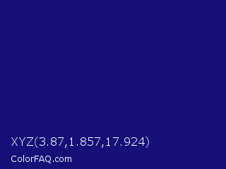 XYZ 3.87,1.857,17.924 Color is a dark indigo color and the nearest color is Deep Koamaru #1b127b. Hex code #150f78 and RGB value is rgb(21,15,120). In RGB color space, this color is composed of 8% red, 6% green, 47% blue, In CMYK color space, this color is composed of 83% cyan, 88% magenta, 0% yellow , 53% black , In HSL color space, this color has a hue angle of 243° , 78% saturation and 26% lightness.