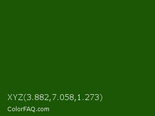 XYZ 3.882,7.058,1.273 Color is a very dark green color and the nearest color is Lincoln Green #195905. Hex code #1b5704 and RGB value is rgb(27,87,4). In RGB color space, this color is composed of 11% red, 34% green, 2% blue, In CMYK color space, this color is composed of 69% cyan, 0% magenta, 95% yellow , 66% black , In HSL color space, this color has a hue angle of 103° , 91% saturation and 18% lightness.