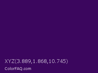 XYZ 3.889,1.868,10.745 Color is a very dark purple color and the nearest color is Ripe Plum #410056. Hex code #3b065e and RGB value is rgb(59,6,94). In RGB color space, this color is composed of 23% red, 2% green, 37% blue, In CMYK color space, this color is composed of 37% cyan, 94% magenta, 0% yellow , 63% black , In HSL color space, this color has a hue angle of 276° , 88% saturation and 20% lightness.