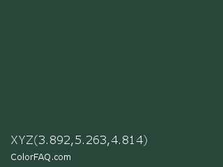 XYZ 3.892,5.263,4.814 Color is a very dark green color and the nearest color is Te Papa Green #1e433c. Hex code #28473a and RGB value is rgb(40,71,58). In RGB color space, this color is composed of 16% red, 28% green, 23% blue, In CMYK color space, this color is composed of 44% cyan, 0% magenta, 18% yellow , 72% black , In HSL color space, this color has a hue angle of 155° , 28% saturation and 22% lightness.