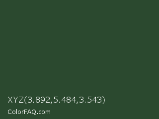 XYZ 3.892,5.484,3.543 Color is a dark green color and the nearest color is Kombu Green #354230. Hex code #2b492f and RGB value is rgb(43,73,47). In RGB color space, this color is composed of 17% red, 29% green, 18% blue, In CMYK color space, this color is composed of 41% cyan, 0% magenta, 36% yellow , 71% black , In HSL color space, this color has a hue angle of 128° , 26% saturation and 23% lightness.