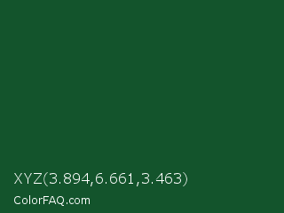 XYZ 3.894,6.661,3.463 Color is a very dark green color and the nearest color is Cal Poly Pomona Green #1e4d2b. Hex code #13542c and RGB value is rgb(19,84,44). In RGB color space, this color is composed of 7% red, 33% green, 17% blue, In CMYK color space, this color is composed of 77% cyan, 0% magenta, 48% yellow , 67% black , In HSL color space, this color has a hue angle of 143° , 63% saturation and 20% lightness.