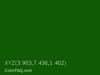 XYZ 3.903,7.436,1.402 Color is a very dark green color and the nearest color is Lincoln Green #195905. Hex code #105a06 and RGB value is rgb(16,90,6). In RGB color space, this color is composed of 6% red, 35% green, 2% blue, In CMYK color space, this color is composed of 82% cyan, 0% magenta, 93% yellow , 65% black , In HSL color space, this color has a hue angle of 113° , 88% saturation and 19% lightness.