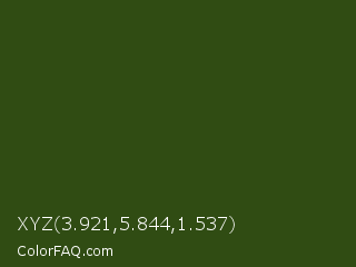 XYZ 3.921,5.844,1.537 Color is a very dark green color and the nearest color is Clover #384910. Hex code #304c13 and RGB value is rgb(48,76,19). In RGB color space, this color is composed of 19% red, 30% green, 7% blue, In CMYK color space, this color is composed of 37% cyan, 0% magenta, 75% yellow , 70% black , In HSL color space, this color has a hue angle of 89° , 60% saturation and 19% lightness.