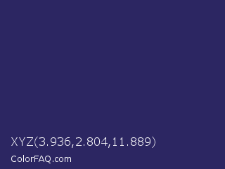 XYZ 3.936,2.804,11.889 Color is a dark indigo color and the nearest color is Deep Koamaru #333366. Hex code #2c2662 and RGB value is rgb(44,38,98). In RGB color space, this color is composed of 17% red, 15% green, 38% blue, In CMYK color space, this color is composed of 55% cyan, 61% magenta, 0% yellow , 62% black , In HSL color space, this color has a hue angle of 246° , 44% saturation and 27% lightness.