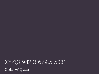 XYZ 3.942,3.679,5.503 Color is a dark purple color and the nearest color is Tuna #353542. Hex code #3b3341 and RGB value is rgb(59,51,65). In RGB color space, this color is composed of 23% red, 20% green, 25% blue, In CMYK color space, this color is composed of 9% cyan, 22% magenta, 0% yellow , 75% black , In HSL color space, this color has a hue angle of 274° , 12% saturation and 23% lightness.