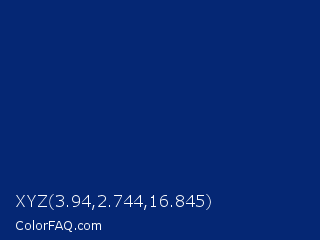 XYZ 3.94,2.744,16.845 Color is a dark blue color and the nearest color is Catalina Blue #062a78. Hex code #052774 and RGB value is rgb(5,39,116). In RGB color space, this color is composed of 2% red, 15% green, 45% blue, In CMYK color space, this color is composed of 96% cyan, 66% magenta, 0% yellow , 55% black , In HSL color space, this color has a hue angle of 222° , 92% saturation and 24% lightness.
