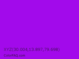 XYZ 30.004,13.897,79.698 Color is a normal purple color and the nearest color is Vivid Violet #9f00ff. Hex code #a20aeb and RGB value is rgb(162,10,235). In RGB color space, this color is composed of 64% red, 4% green, 92% blue, In CMYK color space, this color is composed of 31% cyan, 96% magenta, 0% yellow , 8% black , In HSL color space, this color has a hue angle of 281° , 92% saturation and 48% lightness.