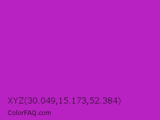 XYZ 30.049,15.173,52.384 Color is a normal magenta color and the nearest color is Steel Pink #cc33cc. Hex code #b821c2 and RGB value is rgb(184,33,194). In RGB color space, this color is composed of 72% red, 13% green, 76% blue, In CMYK color space, this color is composed of 5% cyan, 83% magenta, 0% yellow , 24% black , In HSL color space, this color has a hue angle of 296° , 71% saturation and 45% lightness.