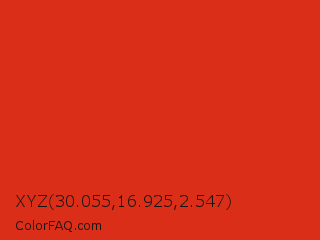 XYZ 30.055,16.925,2.547 Color is a normal red color and the nearest color is Vermilion #d9381e. Hex code #da2e18 and RGB value is rgb(218,46,24). In RGB color space, this color is composed of 85% red, 18% green, 9% blue, In CMYK color space, this color is composed of 0% cyan, 79% magenta, 89% yellow , 15% black , In HSL color space, this color has a hue angle of 7° , 80% saturation and 47% lightness.