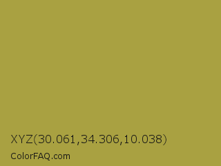 XYZ 30.061,34.306,10.038 Color is a normal yellow color and the nearest color is Brass #b5a642. Hex code #a9a141 and RGB value is rgb(169,161,65). In RGB color space, this color is composed of 66% red, 63% green, 25% blue, In CMYK color space, this color is composed of 0% cyan, 5% magenta, 62% yellow , 34% black , In HSL color space, this color has a hue angle of 55° , 44% saturation and 46% lightness.
