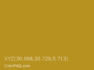 XYZ 30.068,30.729,5.713 Color is a normal orange color and the nearest color is Marigold #b98d28. Hex code #b79220 and RGB value is rgb(183,146,32). In RGB color space, this color is composed of 72% red, 57% green, 13% blue, In CMYK color space, this color is composed of 0% cyan, 20% magenta, 83% yellow , 28% black , In HSL color space, this color has a hue angle of 45° , 70% saturation and 42% lightness.
