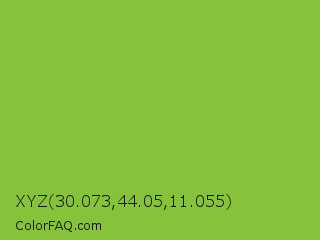 XYZ 30.073,44.05,11.055 Color is a normal green color and the nearest color is Sushi #87ab39. Hex code #87c23b and RGB value is rgb(135,194,59). In RGB color space, this color is composed of 53% red, 76% green, 23% blue, In CMYK color space, this color is composed of 30% cyan, 0% magenta, 70% yellow , 24% black , In HSL color space, this color has a hue angle of 86° , 53% saturation and 50% lightness.