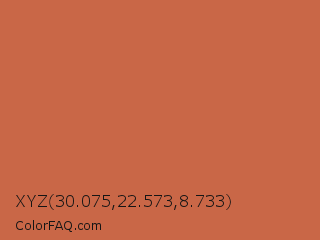 XYZ 30.075,22.573,8.733 Color is a normal color and the nearest color is Copper Red #cb6d51. Hex code #c96747 and RGB value is rgb(201,103,71). In RGB color space, this color is composed of 79% red, 40% green, 28% blue, In CMYK color space, this color is composed of 0% cyan, 49% magenta, 65% yellow , 21% black , In HSL color space, this color has a hue angle of 15° , 55% saturation and 53% lightness.