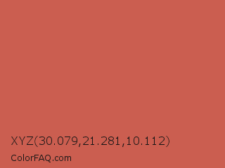 XYZ 30.079,21.281,10.112 Color is a normal red color and the nearest color is Cedar Chest #c95a49. Hex code #cb5e50 and RGB value is rgb(203,94,80). In RGB color space, this color is composed of 80% red, 37% green, 31% blue, In CMYK color space, this color is composed of 0% cyan, 54% magenta, 61% yellow , 20% black , In HSL color space, this color has a hue angle of 7° , 54% saturation and 55% lightness.