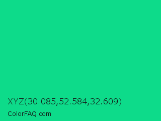 XYZ 30.085,52.584,32.609 Color is a normal green color and the nearest color is Caribbean Green #00cc99. Hex code #0ddb8a and RGB value is rgb(13,219,138). In RGB color space, this color is composed of 5% red, 86% green, 54% blue, In CMYK color space, this color is composed of 94% cyan, 0% magenta, 37% yellow , 14% black , In HSL color space, this color has a hue angle of 156° , 89% saturation and 45% lightness.