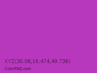 XYZ 30.08,16.474,49.738 Color is a normal magenta color and the nearest color is Byzantine #bd33a4. Hex code #b737bd and RGB value is rgb(183,55,189). In RGB color space, this color is composed of 72% red, 22% green, 74% blue, In CMYK color space, this color is composed of 3% cyan, 71% magenta, 0% yellow , 26% black , In HSL color space, this color has a hue angle of 297° , 55% saturation and 48% lightness.