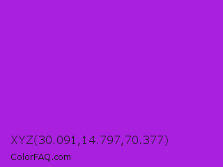 XYZ 30.091,14.797,70.377 Color is a normal purple color and the nearest color is Veronica #a020f0. Hex code #a921de and RGB value is rgb(169,33,222). In RGB color space, this color is composed of 66% red, 13% green, 87% blue, In CMYK color space, this color is composed of 24% cyan, 85% magenta, 0% yellow , 13% black , In HSL color space, this color has a hue angle of 283° , 74% saturation and 50% lightness.