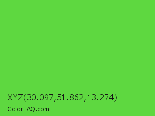 XYZ 30.097,51.862,13.274 Color is a normal green color and the nearest color is Green RYB #66b032. Hex code #5ed840 and RGB value is rgb(94,216,64). In RGB color space, this color is composed of 37% red, 85% green, 25% blue, In CMYK color space, this color is composed of 56% cyan, 0% magenta, 70% yellow , 15% black , In HSL color space, this color has a hue angle of 108° , 66% saturation and 55% lightness.