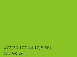 XYZ 30.107,44.12,8.68 Color is a normal green color and the nearest color is Atlantis #97cd2d. Hex code #8ac225 and RGB value is rgb(138,194,37). In RGB color space, this color is composed of 54% red, 76% green, 15% blue, In CMYK color space, this color is composed of 29% cyan, 0% magenta, 81% yellow , 24% black , In HSL color space, this color has a hue angle of 81° , 68% saturation and 45% lightness.