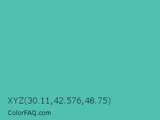 XYZ 30.11,42.576,48.75 Color is a normal cyan color and the nearest color is Puerto Rico #3fc1aa. Hex code #4fc0b2 and RGB value is rgb(79,192,178). In RGB color space, this color is composed of 31% red, 75% green, 70% blue, In CMYK color space, this color is composed of 59% cyan, 0% magenta, 7% yellow , 25% black , In HSL color space, this color has a hue angle of 173° , 47% saturation and 53% lightness.