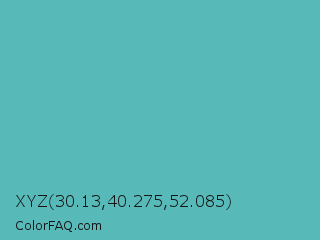 XYZ 30.13,40.275,52.085 Color is a normal cyan color and the nearest color is Fountain Blue #56b4be. Hex code #58b9b9 and RGB value is rgb(88,185,185). In RGB color space, this color is composed of 35% red, 73% green, 73% blue, In CMYK color space, this color is composed of 52% cyan, 0% magenta, 0% yellow , 27% black , In HSL color space, this color has a hue angle of 180° , 41% saturation and 54% lightness.