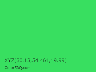 XYZ 30.13,54.461,19.99 Color is a normal green color and the nearest color is UFO Green #3cd070. Hex code #38df60 and RGB value is rgb(56,223,96). In RGB color space, this color is composed of 22% red, 87% green, 38% blue, In CMYK color space, this color is composed of 75% cyan, 0% magenta, 57% yellow , 13% black , In HSL color space, this color has a hue angle of 134° , 72% saturation and 55% lightness.