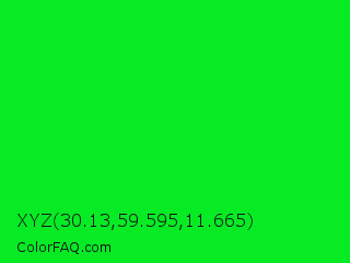 XYZ 30.13,59.595,11.665 Color is a normal green color and the nearest color is Vivid Malachite #00cc33. Hex code #07eb25 and RGB value is rgb(7,235,37). In RGB color space, this color is composed of 3% red, 92% green, 15% blue, In CMYK color space, this color is composed of 97% cyan, 0% magenta, 84% yellow , 8% black , In HSL color space, this color has a hue angle of 128° , 94% saturation and 47% lightness.