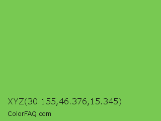 XYZ 30.155,46.376,15.345 Color is a normal green color and the nearest color is Mantis #74c365. Hex code #78c952 and RGB value is rgb(120,201,82). In RGB color space, this color is composed of 47% red, 79% green, 32% blue, In CMYK color space, this color is composed of 40% cyan, 0% magenta, 59% yellow , 21% black , In HSL color space, this color has a hue angle of 101° , 52% saturation and 55% lightness.