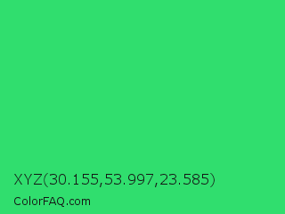 XYZ 30.155,53.997,23.585 Color is a normal green color and the nearest color is UFO Green #3cd070. Hex code #30de6e and RGB value is rgb(48,222,110). In RGB color space, this color is composed of 19% red, 87% green, 43% blue, In CMYK color space, this color is composed of 78% cyan, 0% magenta, 50% yellow , 13% black , In HSL color space, this color has a hue angle of 141° , 73% saturation and 53% lightness.