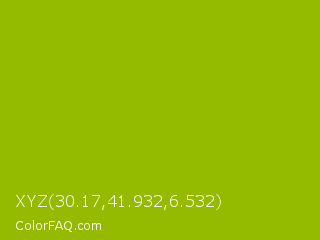 XYZ 30.17,41.932,6.532 Color is a normal lime color and the nearest color is Apple Green #8db600. Hex code #95bb01 and RGB value is rgb(149,187,1). In RGB color space, this color is composed of 58% red, 73% green, 0% blue, In CMYK color space, this color is composed of 20% cyan, 0% magenta, 99% yellow , 27% black , In HSL color space, this color has a hue angle of 72° , 99% saturation and 37% lightness.