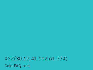 XYZ 30.17,41.992,61.774 Color is a normal cyan color and the nearest color is Maximum Blue Green #30bfbf. Hex code #2bbfc9 and RGB value is rgb(43,191,201). In RGB color space, this color is composed of 17% red, 75% green, 79% blue, In CMYK color space, this color is composed of 79% cyan, 5% magenta, 0% yellow , 21% black , In HSL color space, this color has a hue angle of 184° , 65% saturation and 48% lightness.