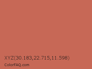 XYZ 30.183,22.715,11.598 Color is a normal red color and the nearest color is Copper Red #cb6d51. Hex code #c76856 and RGB value is rgb(199,104,86). In RGB color space, this color is composed of 78% red, 41% green, 34% blue, In CMYK color space, this color is composed of 0% cyan, 48% magenta, 57% yellow , 22% black , In HSL color space, this color has a hue angle of 10° , 50% saturation and 56% lightness.
