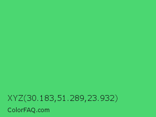 XYZ 30.183,51.289,23.932 Color is a normal green color and the nearest color is UFO Green #3cd070. Hex code #4bd771 and RGB value is rgb(75,215,113). In RGB color space, this color is composed of 29% red, 84% green, 44% blue, In CMYK color space, this color is composed of 65% cyan, 0% magenta, 47% yellow , 16% black , In HSL color space, this color has a hue angle of 136° , 64% saturation and 57% lightness.