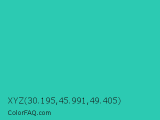 XYZ 30.195,45.991,49.405 Color is a normal cyan color and the nearest color is Maximum Blue Green #30bfbf. Hex code #2ccab2 and RGB value is rgb(44,202,178). In RGB color space, this color is composed of 17% red, 79% green, 70% blue, In CMYK color space, this color is composed of 78% cyan, 0% magenta, 12% yellow , 21% black , In HSL color space, this color has a hue angle of 171° , 64% saturation and 48% lightness.