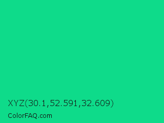 XYZ 30.1,52.591,32.609 Color is a normal green color and the nearest color is Caribbean Green #00cc99. Hex code #0edb8a and RGB value is rgb(14,219,138). In RGB color space, this color is composed of 5% red, 86% green, 54% blue, In CMYK color space, this color is composed of 94% cyan, 0% magenta, 37% yellow , 14% black , In HSL color space, this color has a hue angle of 156° , 88% saturation and 46% lightness.