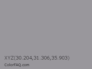 XYZ 30.204,31.306,35.903 Color is a normal violet color and the nearest color is Spanish Gray #989898. Hex code #99979c and RGB value is rgb(153,151,156). In RGB color space, this color is composed of 60% red, 59% green, 61% blue, In CMYK color space, this color is composed of 2% cyan, 3% magenta, 0% yellow , 39% black , In HSL color space, this color has a hue angle of 264° , 2% saturation and 60% lightness.