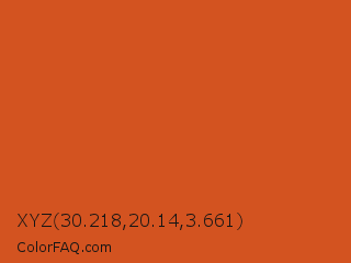 XYZ 30.218,20.14,3.661 Color is a normal orange color and the nearest color is Flame #e25822. Hex code #d35320 and RGB value is rgb(211,83,32). In RGB color space, this color is composed of 83% red, 33% green, 13% blue, In CMYK color space, this color is composed of 0% cyan, 61% magenta, 85% yellow , 17% black , In HSL color space, this color has a hue angle of 17° , 74% saturation and 48% lightness.